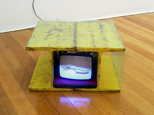 digital animation, dvd disc and player, ebony, I-beam, plastic, suede, television set
